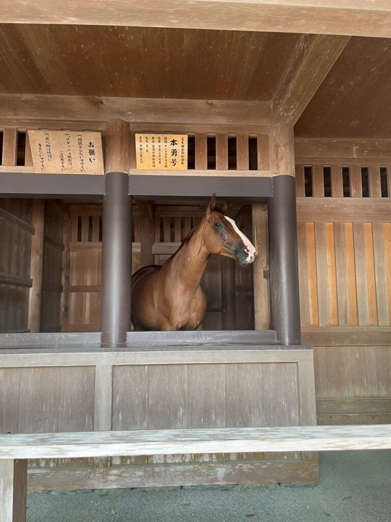 皇室から献上されている神馬がいる場所。毎月1日、11日、21日の8時くらいに正宮にお参りをします。
