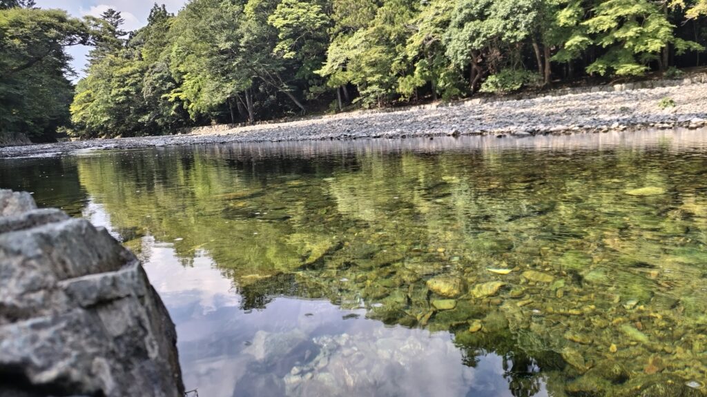 五十鈴川は、別名「御裳濯側」と呼ばれています。倭姫命が御裳のすそを濯いだことから名付けられたと伝えられています。御手洗場では、手水舎と同じようにお清めができます。